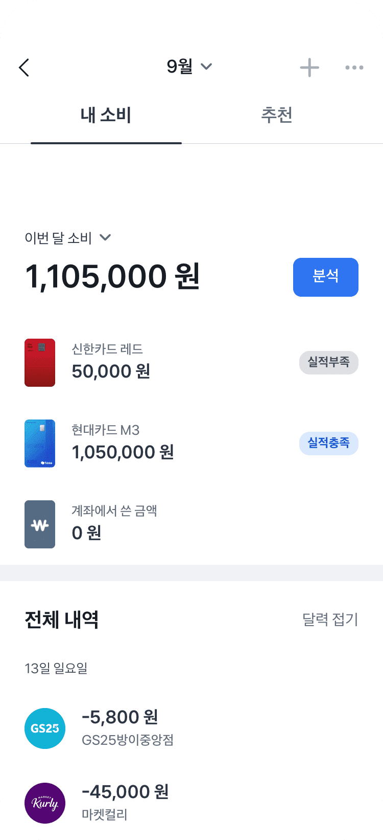 일자별 소비와 수입까지 한 번에 볼 수 있어요.